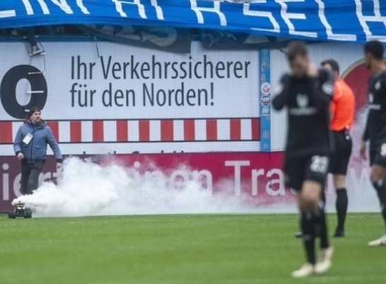 Hansa Rostock ile Hamburg arasında oynanan Bundesliga 2 maçında ev sahibi takımın taraftarları uzaktan kumandalı arabalarla çimlerin üzerinde yarışarak oyunu böldüler. Bu mini arabalara takılı mavi ve beyaz duman kapları oyun alanını geçici olarak dumanla kapladı.