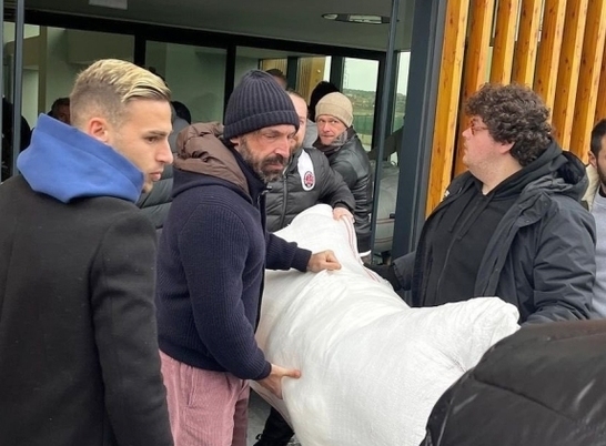 Fenerbahçe, battaniye ve bebek kıyafetlerinin kamyonlara yüklenmesine yardım edenler arasında eski Leeds oyuncusu Ezgjan Alioski'nin de yer aldığı sahayı açtı.