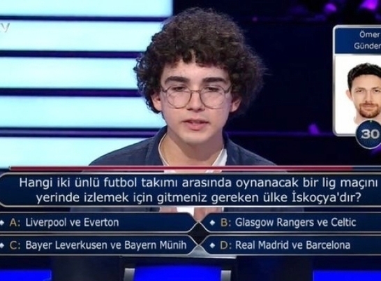 Yarışmacıya yöneltilen, "Hangi iki ünlü futbol takımı arasında oynanacak bir lig maçını yerinde izlemek için gitmeniz gereken ülke İskoçya'dır?" sorusuna önce seyirci, sonra da telefon joker hakkını kullanarak yanıt verdi.