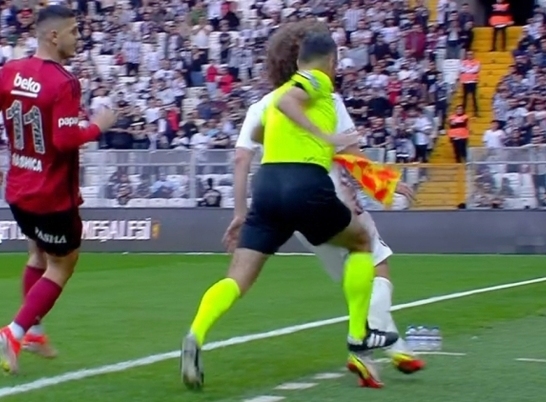 Hataysporlu Burak Yılmaz, Beşiktaşlı Rashica ile taç çizgisi kenarından mücadele ederken yardımcı hakem İbrahim Çağlar Uyarcan'ın aşil tendonuna basması sonrası yerde kaldı.