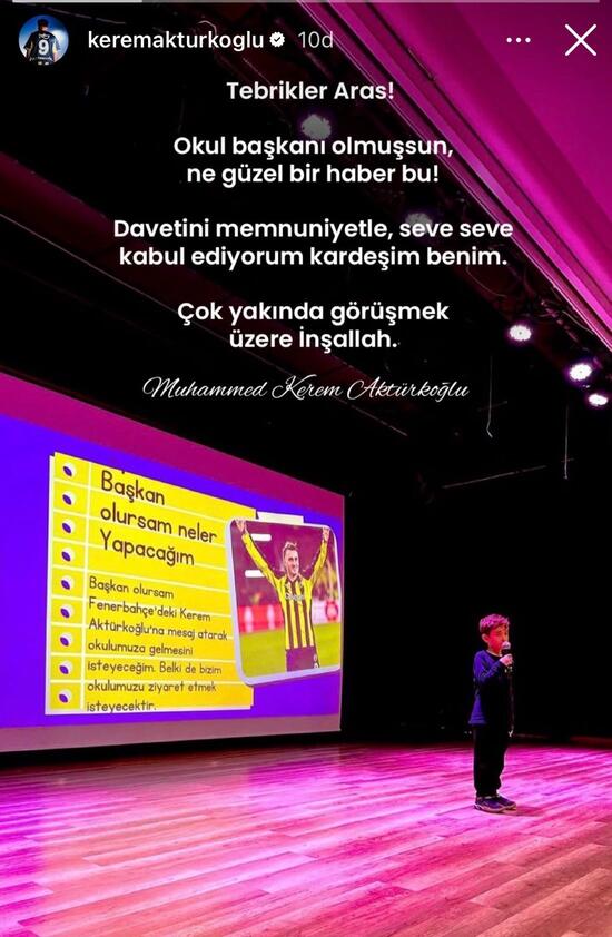 Okul başkanlığı seçiminde hazırladığı sunumda, "Başkan olursam Kerem Aktürkoğlu'na mesaj atarak okulumuza gelmesini isteyeceğim." diyen minik Aras'a, yıldız futbolcudan anlamlı bir cevap geldi.